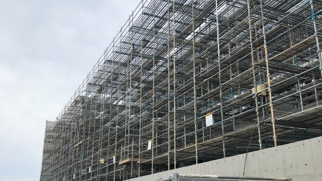 大規模建築現場 外周全面足場工事|多層くさび式足場施工事例
